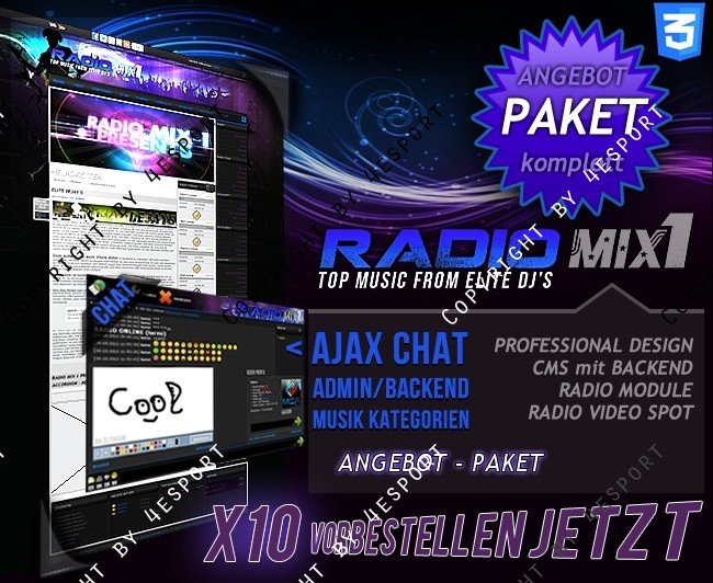 • CMS WEBSPELL + RADIO UPDATE V1.0 (Hier sind alle Exklusiven Module zu dem Design inkl. Installationsdienst als PAKET vorhanden.)